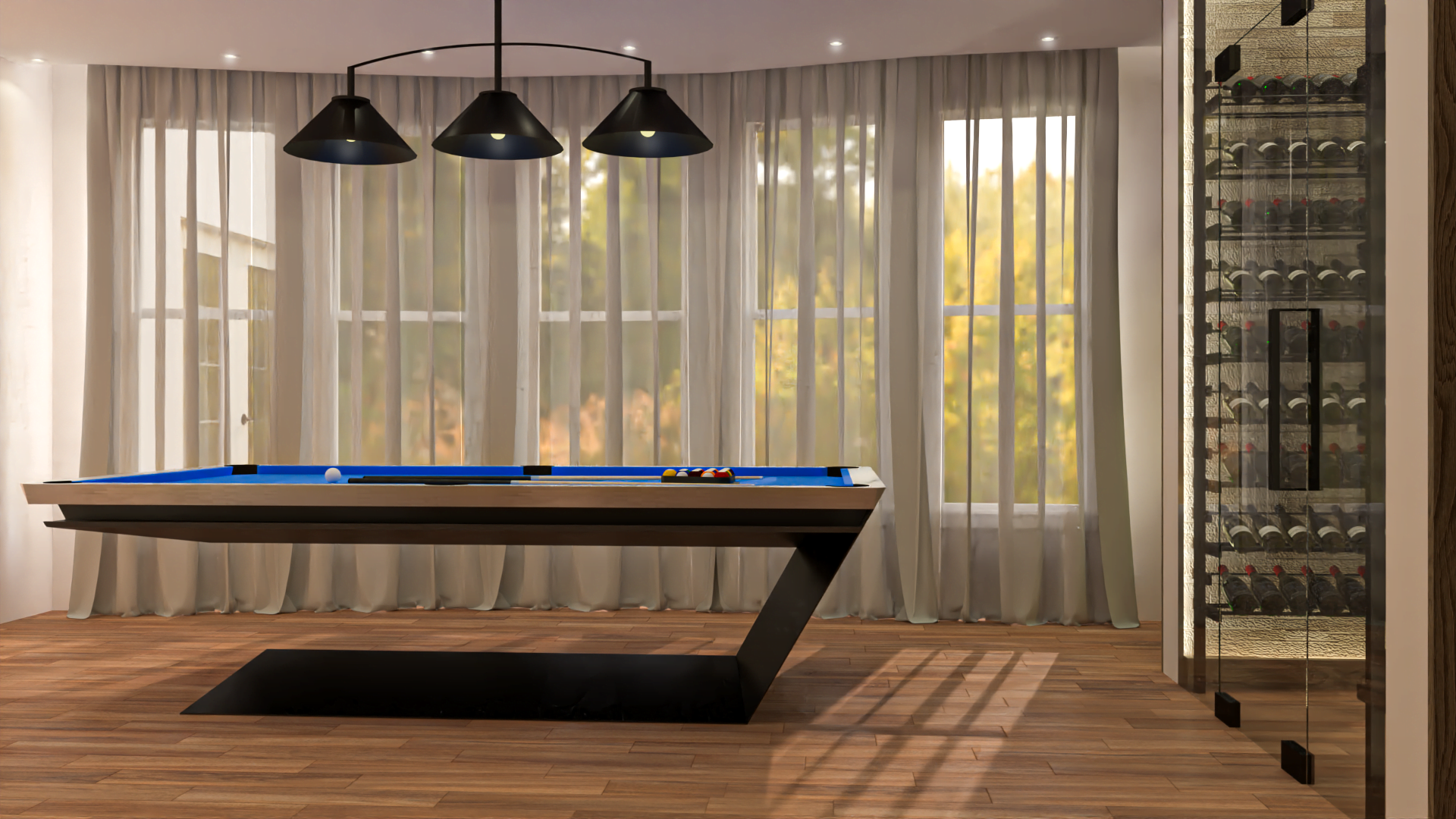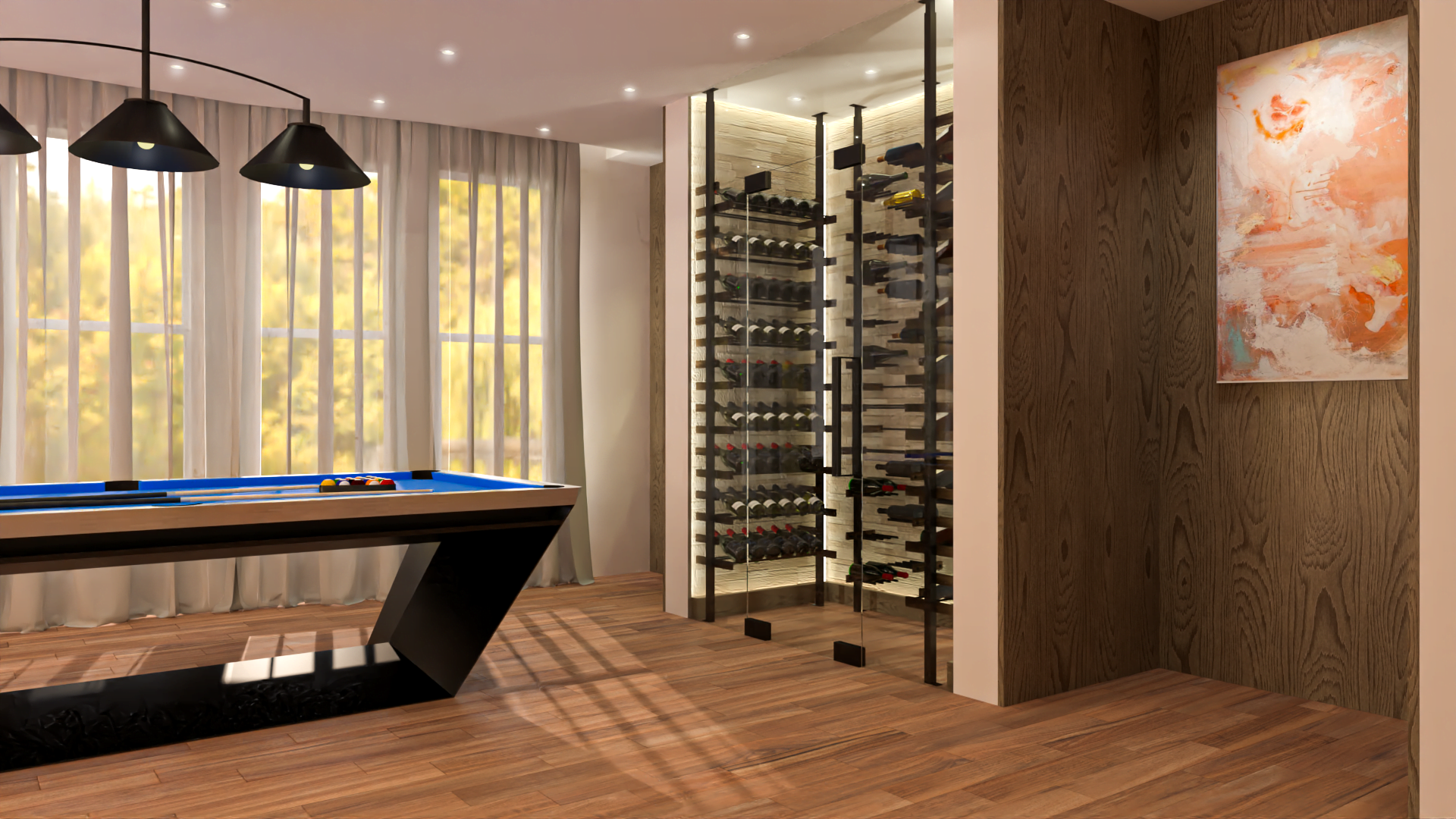 It combines a pool table setup with a wine display, creating a sophisticated, multi-functional space ideal for leisure and entertainment. The use of warm wood textures, ambient lighting, and the open glass wine storage adds a luxurious yet cozy feel to the room, making it perfect for hosting or relaxing.